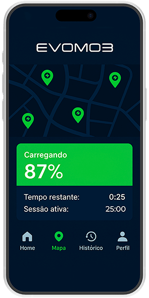 O app Evomob coloca você no comando. Acompanhe recargas em tempo real, visualize o consumo, agende horários, localize estações próximas e pague com facilidade — tudo na palma da mão. Pensado para motoristas, síndicos, parceiros e frotas, o app centraliza a gestão da mobilidade elétrica com tecnologia prática, segura, intuitiva e acessível de qualquer lugar.